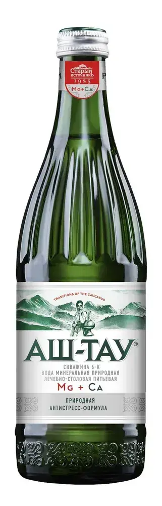 Вода минеральная природная лечебно-столовая питьевая «Аш-Тау, Скважина 6-К» (Красногорское месторождение, Усть-Джегутинский район) Одно из главных преимуществ воды Аш-Тау® — высокое содержание магния, кальция и калия. Причем соотношения Сa и Мg 2:1, что обеспечивает максимальную пользу для организма. Вместе все элементы защищают организм от вредных воздействий и на клеточном уровне помогают вырабатывать жизненную энергию. Вода добывается из собственной скважины компании, находящейся в природной охраняемой зоне на территории Тебердинского заповедника. Ее окружают живописные горы Северо-Кавказского хребта, а рядом несет свои воды река Кубань, берущая начало на высоте 2970 м из языка ледника Уллукам. Вкус ярко выраженный, немного солоноватый, вода плотная и насыщенная минералами. Применение: Болезни пищевода (эзофагит, гастроэзофагеальная рефлюксная болезнь); хронические гастриты с нормальной и повышенной секреторными функциями желудка; язвенная болезнь желудка и двенадцатиперстной кишки; болезни кишечника (синдром раздраженного кишечника, дискинезия кишечника); болезни печени, желчного пузыря и желчевыводящих путей; болезни поджелудочной железы (хронический панкреатит); нарушение органов пищеварения после оперативных вмешательств по поводу язвенной болезни желудка; постхолецистэктомические синдромы; болезни обмена веществ (сахарный диабет, ожирение, нарушение солевого и липидного обмена); болезни мочевыводящих путей (хронический пиелонефрит, мочекаменная болезнь, хронический цистит, уретрит). Вода применяется при вышеуказанных заболеваниях только вне фазы обострения Группа: Гидрокарбонатно-хлоридная натриевая (кальцево-натриевая). Газированная. Скважина: № 6-К, Красногорское месторождение (Усть-Джегутинский район, КЧР) Изготовитель: ЗАО «ВОДНАЯ КОМПАНИЯ «СТАРЫЙ ИСТОЧНИК»