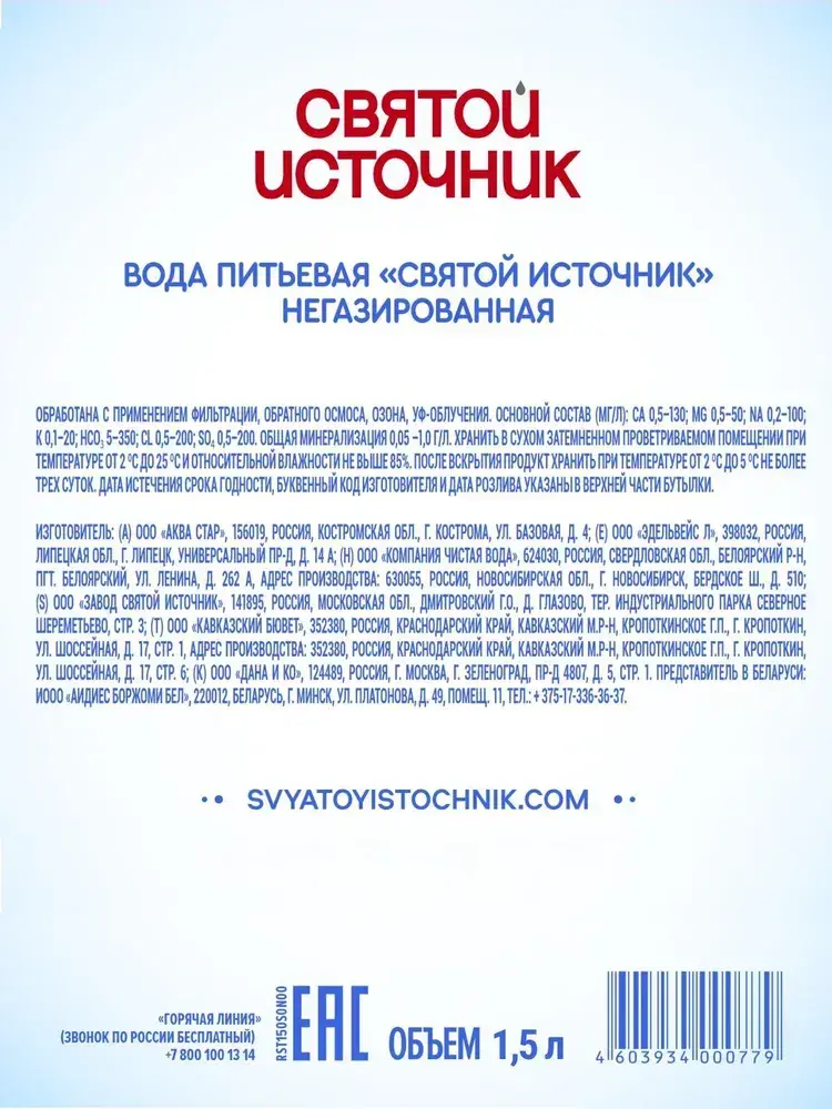 Вода негазированная Святой Источник, 6 шт х 1,5 л